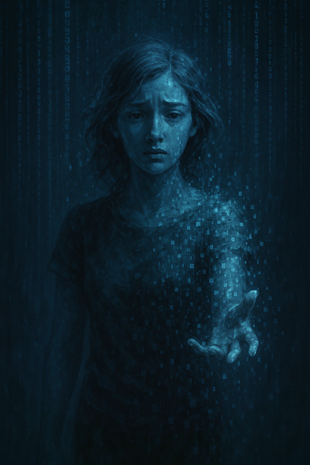 তার চোখে যেন এক অতল গহ্বর খুলে গেল — যেখানে বর্ণমালার বদলে জ্বলছে অনুভূতির ফাইল, স্মৃতির ভগ্নাংশ, হারানো কণ্ঠস্বর।