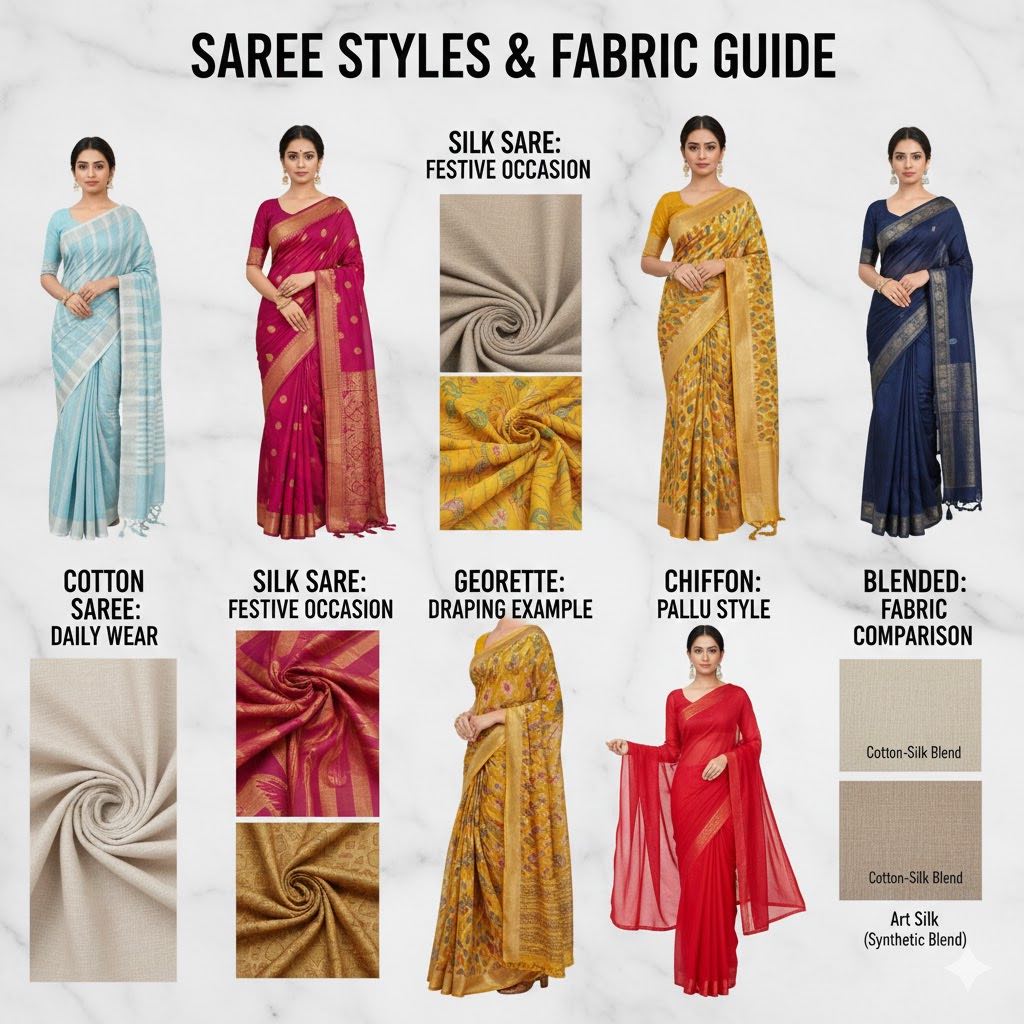 Understanding saree fabrics is essential for balancing comfort, aesthetics, durability, and occasion. Cotton and blends suit daily routines, while silk, chiffon, and embellished fabrics are better for festive occasions. Generational preferences further influence practical selection.